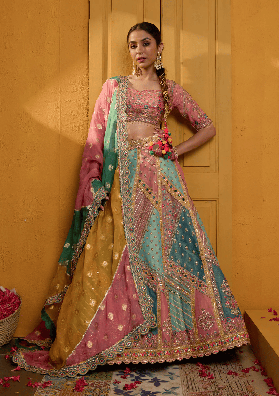 Step into a canvas of rich culture and regal charm with Koskii's Banarasi Lehenga, where every twirl tells a tale of elegance. Wrapped in the luxury of fine Banarasi fabric, this lehenga boasts vibrant multicolor embroidery that captures the essence of spirited celebrations. The meticulous threadwork on this masterpiece adds a hint of playfulness and grandeur, perfect for those who dress to impress and celebrate life with zeal!